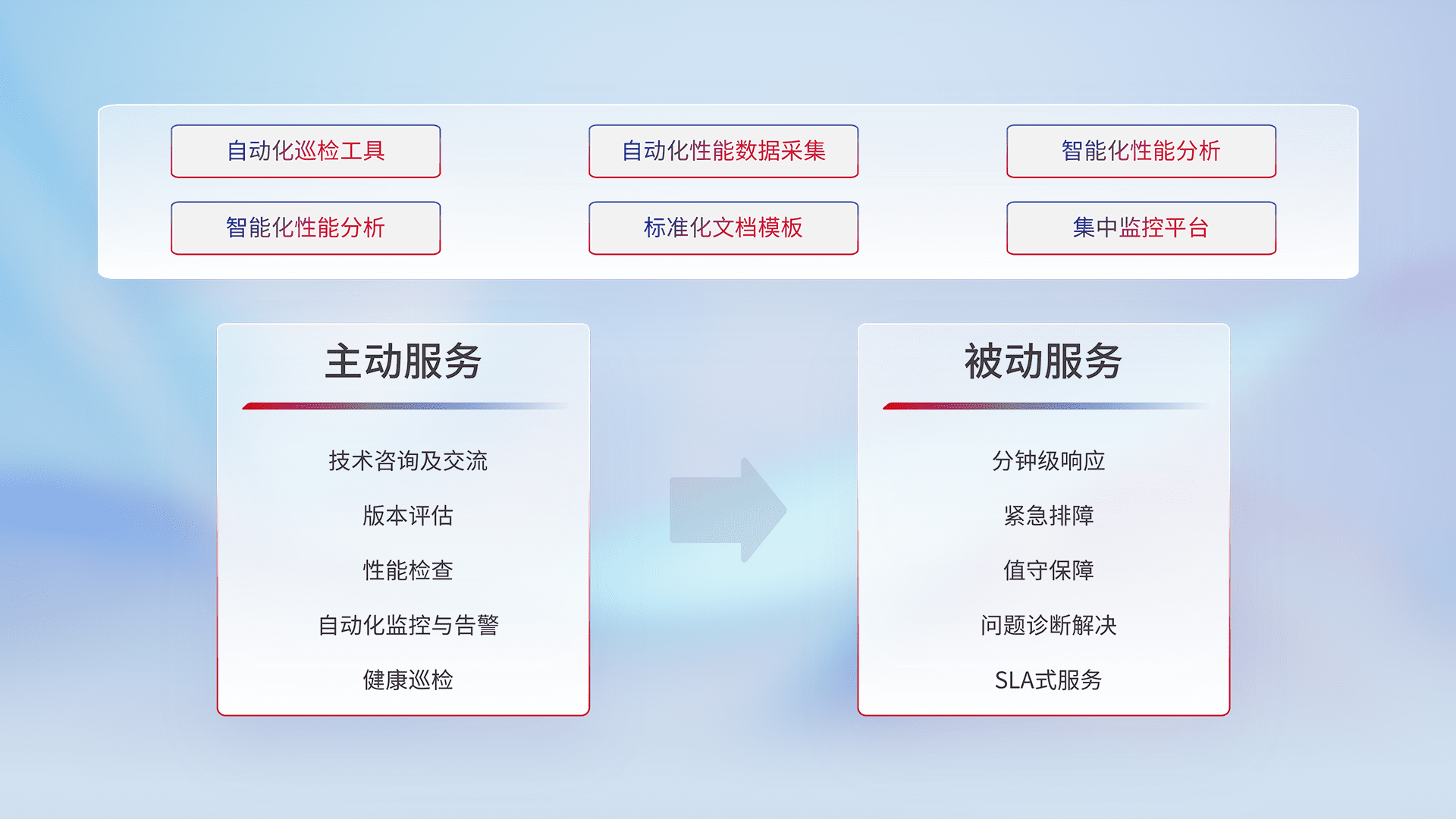 智能化工具和标准化文档,,,,保障服务质量,,,,提供主动服务(包含技术咨询、、版本评估、、、、性能检查、、自动化监控与告警、、健康巡检)和被动服务包含(分钟级响应、、紧急排障、、、、值守保障、、、、问题诊断解决、、SLA服务)。。。
